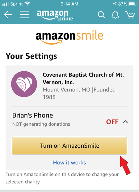 - Follow steps 3-5 for turning AmazonSmile on in your mobile app. (See above.)